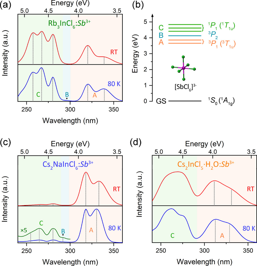 图 2.(a) Rb3InCl6:Sb3+,(c)Cs2NaInCl6:Sb3+和 (d)Cs2InCl5·H2O:Sb3+在室温和80 K下的激发光谱。(b)Rb3InCl6:Sb3+在室温下的能级精细结构