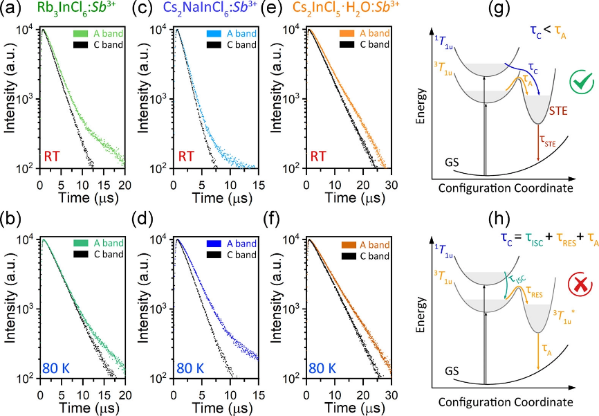 图 3. (a-f) 不同激发带激发时Rb3InCl6:Sb3+, Cs2NaInCl6:Sb3+和 Cs2InCl5·H2O:Sb3+在室温和80 K下的衰减曲线。(g,h)从STE能级到基态,以及从3Pn通过隙间穿越到1S0基态的光物理过程示意。