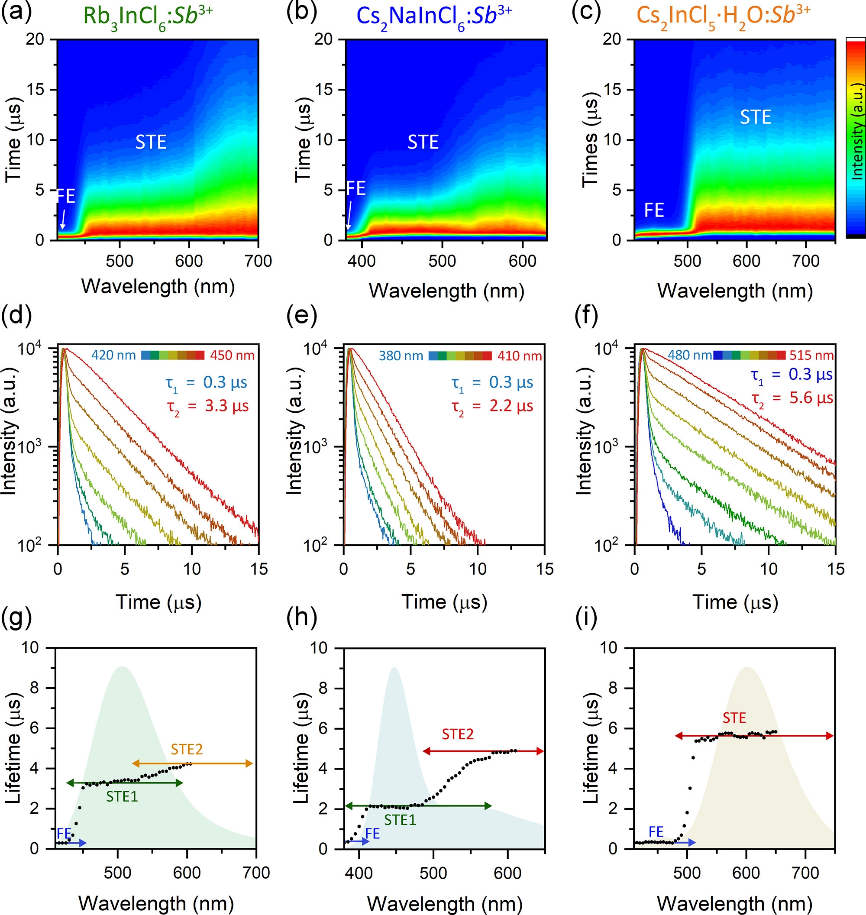 图 4. 80 K时,在C band激发下(a) Rb3InCl6:Sb3+,(b) Cs2NaInCl6:Sb3+和 (c) Cs2InCl5·H2O:Sb3+的寿命mapping;(d)Rb3InCl6:Sb3+,(e) Cs2NaInCl6:Sb3+和 (f) Cs2InCl5·H2O:Sb3+分别在 420–450 nm、380–410 nm 和 480–515 nm 的波长范围的衰减曲线;(g)Rb3InCl6:Sb3+,(h)Cs2NaInCl6:Sb3+和 (i) Cs2InCl5·H2O:Sb3+的PL的形状和FE,STE1和STE2发射的波长分布范围(分别由彩色背景和双向箭头表示)。