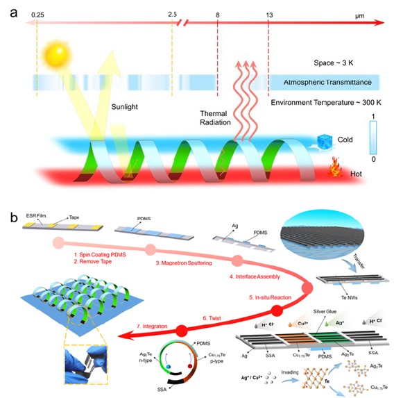 近期,中科大俞书宏教授和刘建伟教授(共同通讯作者)等人设计了一种柔性的三维双面螺旋带结构。在这一结构中,排列良好的碲(Te)纳米线薄膜与Ag+和Cu2+发生原位氧化还原过程,最终在一张薄膜上同时产生n型、p型和光热端。通过将冷端与被动辐射制冷技术结合、热端与SSA技术结合,该结构可实现全天候发电和显著温度梯度(ΔT=29.5 K)。因此,作者认为,这一设计策略为高效热管理提供了一种新的思路。该文共同第一作者为Cheng Chen和Bin Zhao,文章以题为“Janus Helical Ribbon Structure of Ordered Nanowire Films for Flexible Solar Thermoelectric Devices”发布在国际著名期刊Advanced Materials上。