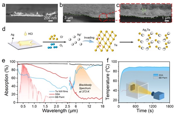 (d)银薄膜与碲纳米线薄膜的反应示意图;