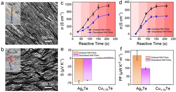 (e)反应150s后有序/无序纳米线的Seebeck系数;