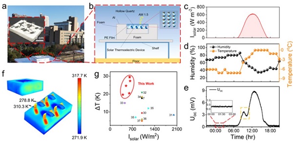 太阳能热电(STE)器件可在不产生温室气体的情况下将光/热转换成电力。在这一体系中,器件的能量转换效率不仅取决于热电材料,也高度依赖于热电臂上的温度梯度(ΔT)。过去十年里,人们已经开发了多种策略(包括热电臂上实现热阻抗以及在热电器件的冷热两端进行温度管理等)以实现显著的温度梯度。然而,这些策略在大尺寸应用中成本剧增,且还无法在干燥环境中保持较低的冷端(cold side)温度,也就是说,在大尺寸应用中高效维持理想的温度梯度目前来看依然是一个艰巨的挑战。
