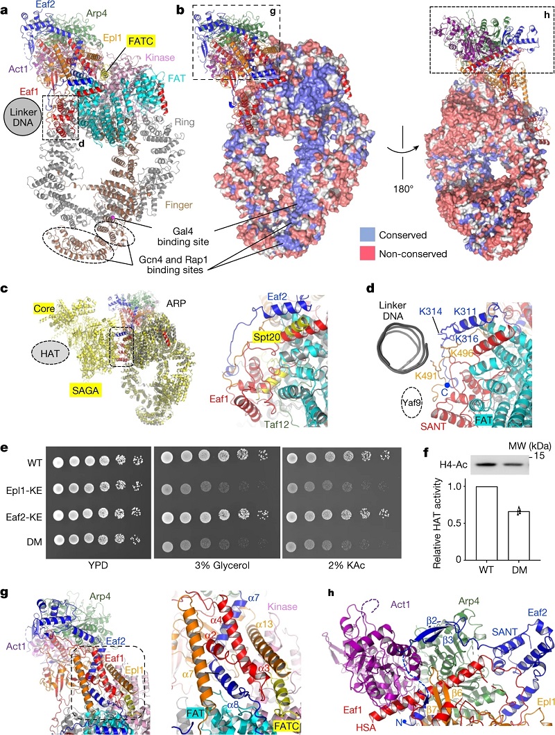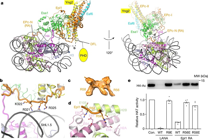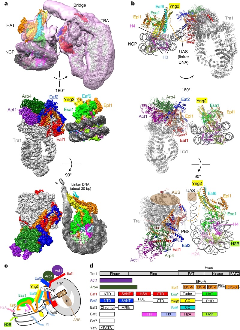 真核生物中的脱氧核糖核酸包裹在组蛋白八聚体周围形成核小体(nucleosomes),其是染色质的基本单位。组蛋白H4的N端与附近的核小体相互作用,在高阶染色质结构的形成和异染色质沉默中起着重要作用。酵母中的NuA4及其在哺乳动物细胞中的同源物Tip60复合体是催化H4乙酰化的关键酶,而H4乙酰化反过来又调节染色质包装,并在转录激活和DNA修复中发挥作用。NuA4包含13个 亚单位,其中Esa1是乙酰化反应的催化亚单位,Tra1是与多种转录激活剂或转录因子结合,以招募NuA4进行靶向基因激活的支架亚单位。Esa1与Epl1、Yng2和Eaf6相互作用形成Piccolo亚复合物,通过基于位置的机制在核小体的背景下实现选择性H4乙酰化(H4-Ac)。Tra1是另一种转录辅激活物HAT复合物SAGA共有的共同亚单位,SAGA催化核小体上的H3乙酰化。虽然NuA4复合物具有基本重要性,但是目前可用的结构分辨率很低,HAT复合物如何与核小体底物相互作用尚不清楚。