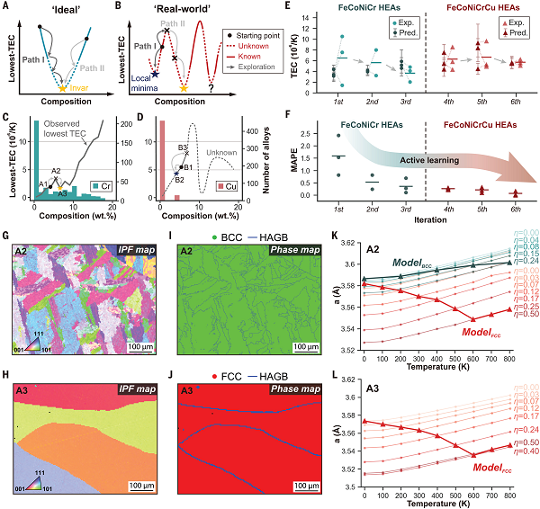 了解成分-性能关系背后的物理基础是合金设计的关键任务,对于成分复杂的材料来说,这是一项特别具有挑战性的任务。原则上,具有有趣特性的HEAs可以隐藏在实际上无限大且尚未开发的成分空间中,这是一种将目标合金设计置于最难测试的情况。因此,研究人员开发了一个广泛适用的主动学习框架,该框架结合了生成模型、回归集成、物理驱动学习和HEAs合成设计实验。研究方法证明了它在使用非常稀疏的实验数据设计高熵因瓦合金方面的能力。与传统的合金设计方法相比,整个工作流程只需要几个月,而合金设计方法需要多年和更多的实验。期望未来此方法可以在高熵合金设计中同时优化多个性能,并能够应用到其它结构和功能材料的设计和优化中。