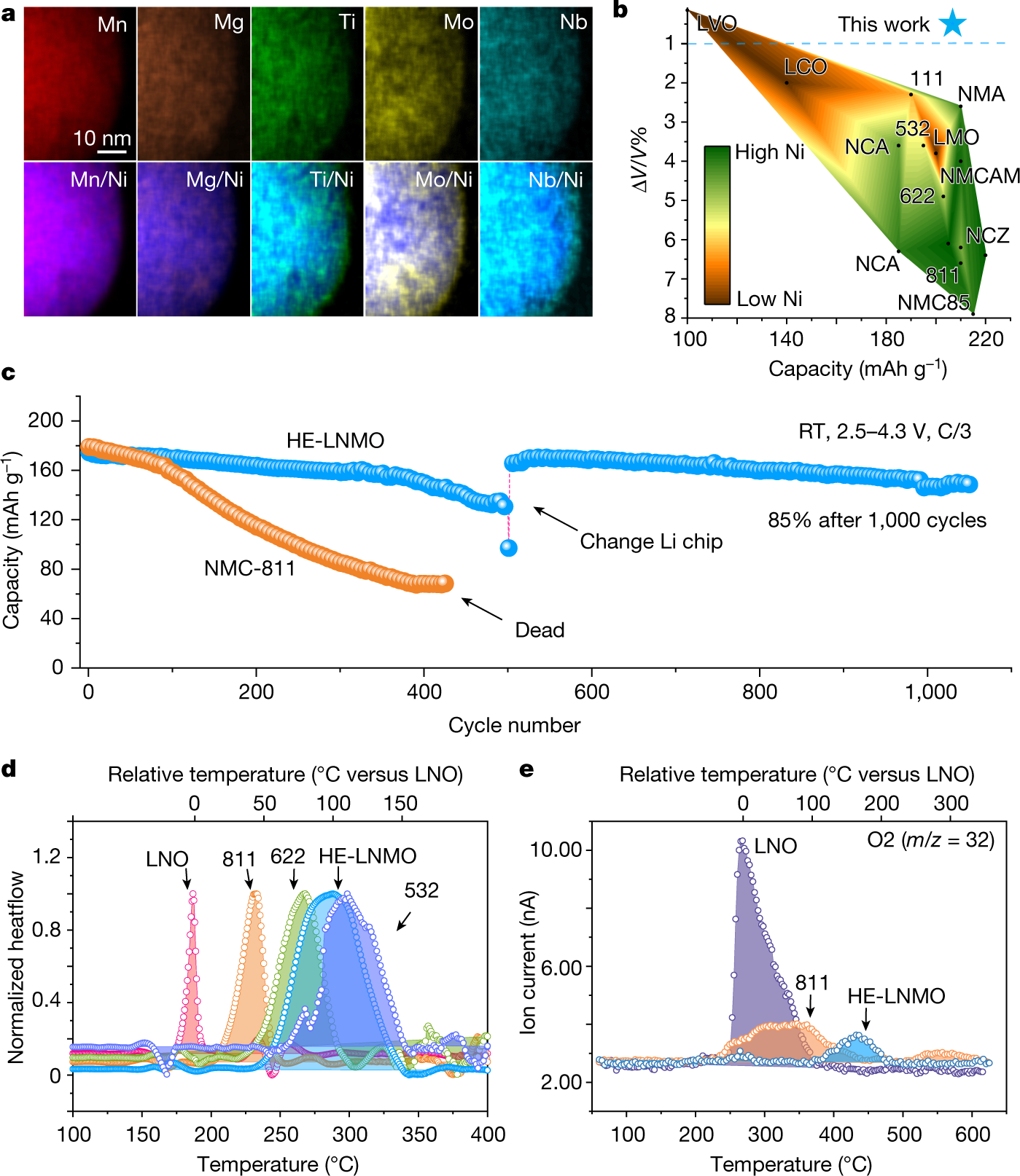 图1 E-LNMO阴极的超级稳定性;a,掺杂元素的EDS图及其图与Ni重叠。b,不同Ni含量的HE-LNMO和其他正极材料的体积随容量的变化。c,含有HE-LNMO和NMC-811的电池在c /3条件下的循环寿命,截止电压2.5-4.3 V(相对于Li/Li+)。d,降解LiNiO2(LNO)、NMC-811、NMC-622、HE-LNMO和NMC-532的DSC分析。e, LNO、NMC-811和HE-LNMO的TGA-MS。高氧损失温度和低氧强度证实了HE-LNMO优越的热稳定性。© 2022 Springer Nature