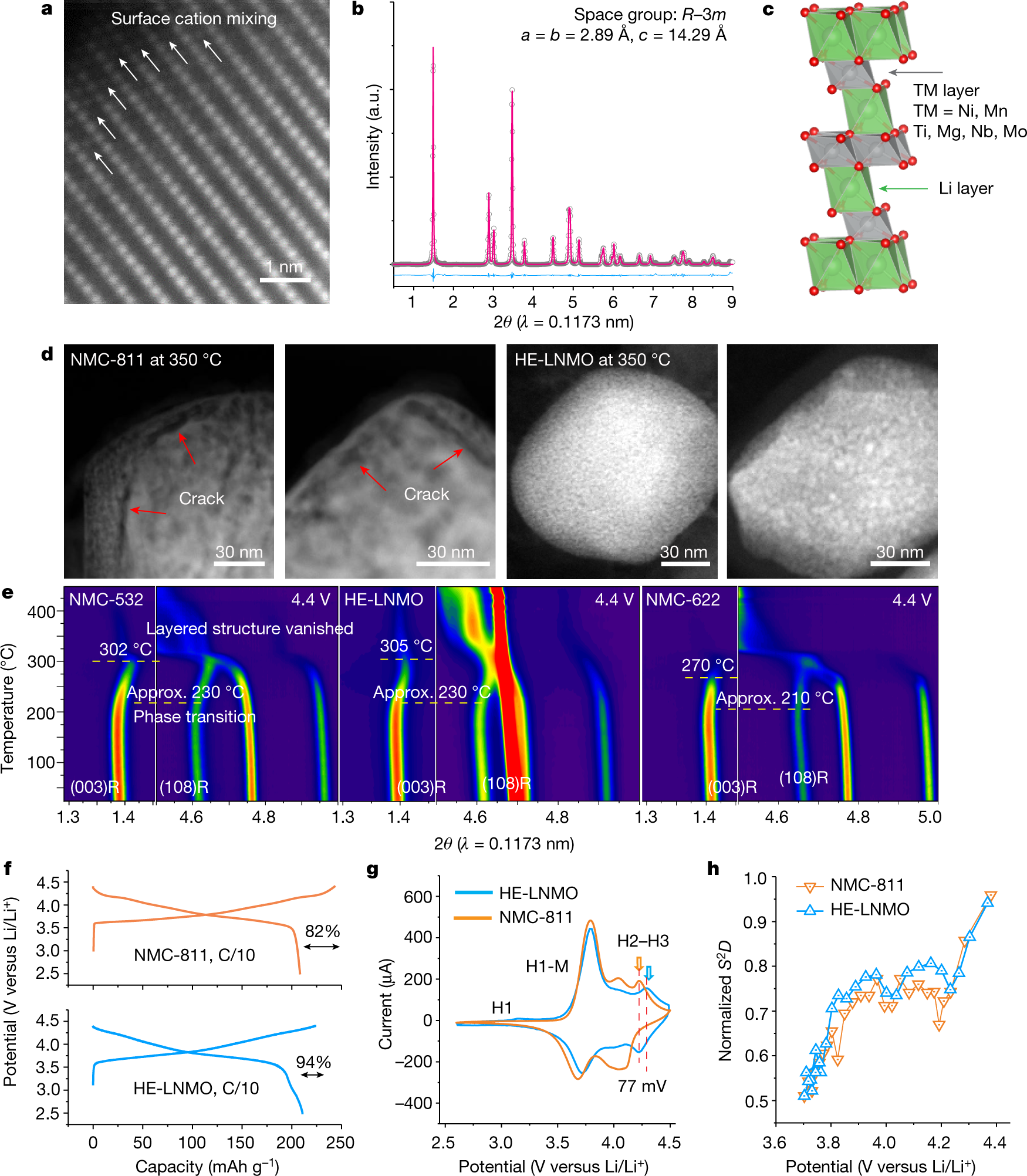 图2 HE-LNMO层状阴极的结构和电化学表征;a,原始HE-LNMO材料的代表性原子分辨率HAADF-STEM图像;b、HE-LNMO的XRD谱图及拟合曲线。c,具有O3晶格的HE-LNMO原子模型。d,原位加热后溶解的NMC-811(左)和HE-LNMO(右)的代表性HAADF-STEM图像。e,原位加热过程中释放阴极的同步辐射XRD图。f, NMC-811和HE-LNMO的初始充放电曲线和哥伦布效率。g, HE-LNMO和NMC-811的第二周期CV。h,GITT法得到HE-LNMO和NMC-811在30°C下的Li+扩散常数。© 2022 Springer Nature