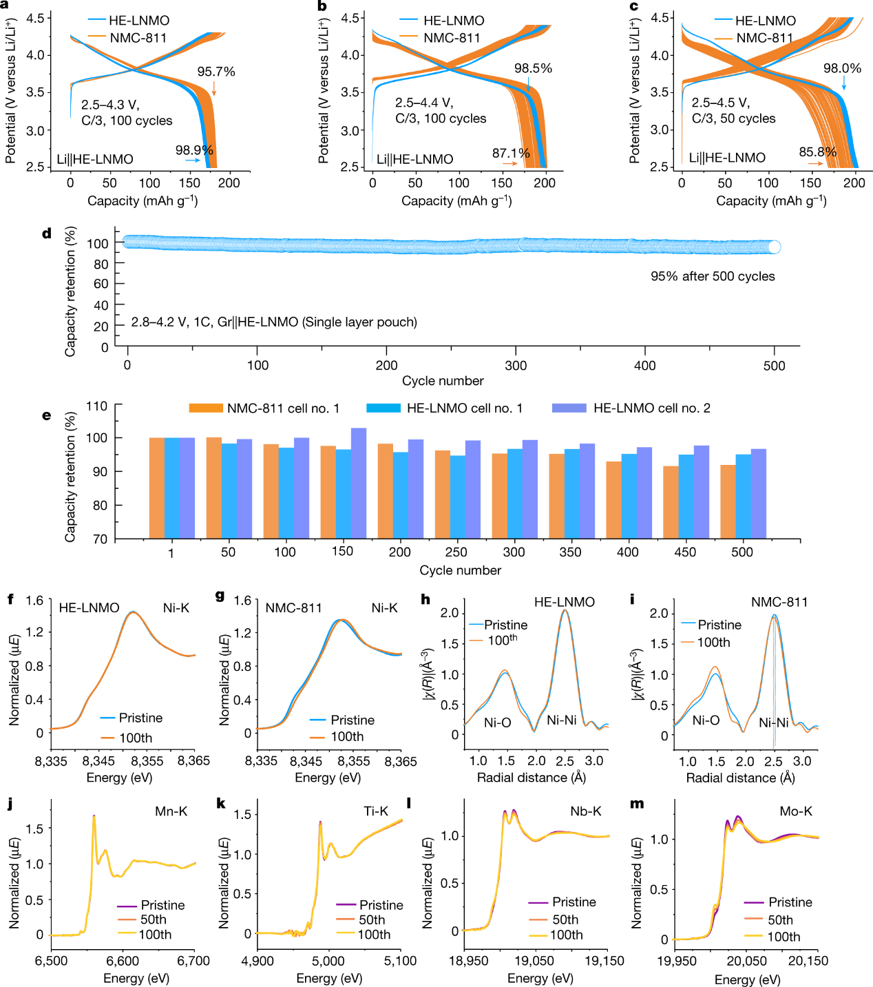 图3 HE-LNMO的循环稳定性和局部环境稳定性;a -c,含HE-LNMO和NMC-811电池的长周期充放电分布,分别在2.5-4.3 V,电流c /3下(相对于Li/Li+) (a)、2.5-4.4 V(相对于Li/Li+) (b)和2.5-4.5 V(相对于Li/Li+) (c)。d,e, HE-LNMO (d)和NMC-811 (e)在使用石墨(Gr)作为阳极、截止电压2.8-4.2 V的袋式电池中的长期循环容量保留。f,g,原始和循环HE-LNMO (f)和NMC-811(g)的Ni-K边XANES谱。h,i,原始和循环HE-LNMO (h)和NMC-811(i)的FT-EXAFS。不同循环后HE-LNMO Mn-K (j)、Ti-K (k)、Nb-K (l)、Mo-K (m)边的XANES。© 2022 Springer Nature