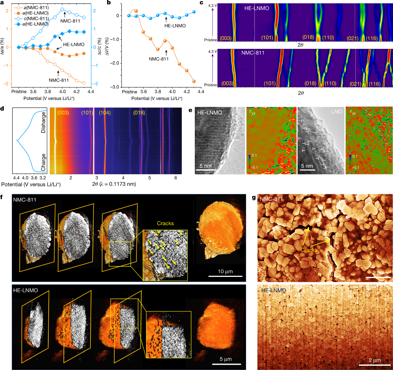 图4 HE-LNMO的结构和力学稳定性;a,b, HE-LNMO与NMC-811相比第一次充电时的晶格参数(a和c轴)和体积变化(3.0-4.3 V)(相对于Li/Li+)。c, HE-LNMO与NMC-811的XRD谱图比较。d, HE-LNMO充放电过程中基于同步加速器的原位XRD图。e,几何相分析(GPA)得到原位降解HE-LNMO和LNO的应变状态。在LNO中发现大量脱位。f,基于同步加速器的TXM断层扫描显示了NMC-811和HE-LNMO二次粒子在长期循环(100次循环,2.5-4.4 V(与Li/Li+相比),1C)后的3D结构。在循环的NMC-811(上面板)中发现了大量的裂缝(箭头所示),而在HE-LNMO(下面板)中没有观察到明显的裂缝。g, NMC-811(上)和HE-LNMO(下)二次粒子的代表性SEM截面图像。© 2022 Springer Nature