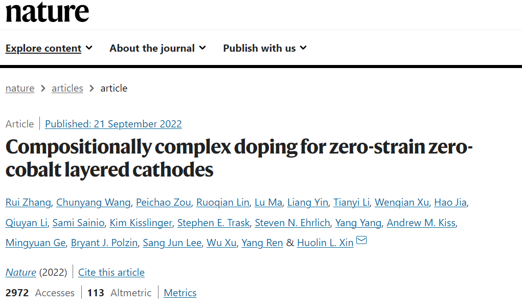 近日,加州大学尔湾分校忻获麟教授等人通过使用一种新的合成复合体(高熵)掺杂策略,成功地制备了一个高Ni,零Co的层状阴极,具有极高的热稳定性和循环稳定性。结合x射线衍射、透射电子显微镜和纳米断层扫描,发现该材料在较宽的电化学窗口内,阴极的体积变化几乎为零,从而大大减少了晶格缺陷和局部应变引起的裂纹。原位加热实验表明,新阴极的热稳定性明显提高,达到了超稳定NMC-532的水平。由于热稳定性的显著提高和零体积变化,它表现出极大的容量提高。这项工作解决了高镍、零钴正极材料长期存在的安全性和稳定性问题,为安全、长寿命锂离子电池提供了一种商业上可行的阳极,并为嵌入电极抑制应变和相变提供了一种通用策略。相关成果以“Compositionally complex doping for zero-strain zero-cobalt layered cathodes”为题发表在Nature期刊上。