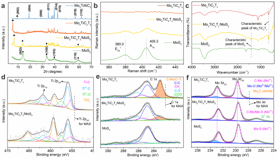 图3 (a)Mo2TiAlC2、Mo2TiC2Tx、MoS2和复合材料的XRD图谱。(b-c) Mo2TiC2Tx、MoS2和复合材料的拉曼光谱与FTIR光谱。(d)Mo2TiC2Tx和Mo2TiC2Tx/MoS2复合材料的Ti 2p的 HRXPS光谱。(e-f)Mo2TiC2Tx、MoS2与Mo2TiC2Tx/MoS2复合材料的C 1s与Mo 3d的 HRXPS光谱。