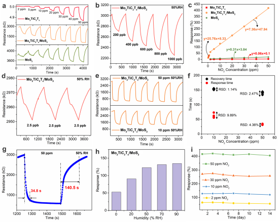 图4(a)Mo2TiC2Tx、MoS2、Mo2TiC2Tx/MoS2基气体传感器对2–50 ppm NO2的电阻响应曲线。(b)Mo2TiC2Tx/MoS2传感器对200–1000 ppb NO2的电阻响应曲线。(c)线性拟合曲线。(d)传感器对2.5 ppb NO2的电阻响应曲线。(e)传感器对10 ppm和50 ppm NO2的重复性曲线。(f)传感器在10 ppm和50 ppm NO2下的响应/恢复时间。(g)放大的响应曲线。(h)湿度对10 ppm NO2气体响应的影响。(i)稳定性测试曲线。