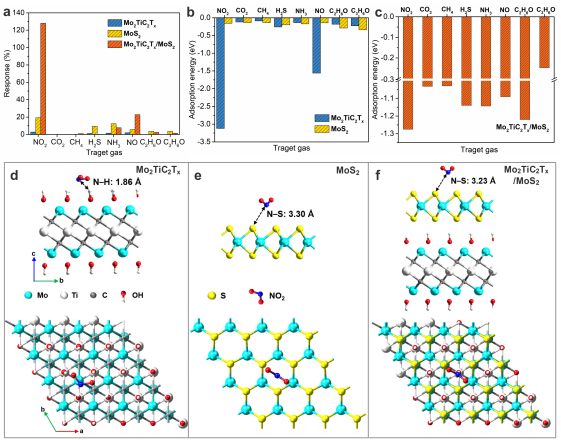 图5(a)Mo2TiC2Tx、MoS2和Mo2TiC2Tx/MoS2基传感器对多种气体的选择性响应。(b)Mo2TiC2Tx与MoS2对多种气体的吸附能。(c)复合材料对多种气体的吸附能。(d-f)Mo2TiC2Tx,MoS2与Mo2TiC2Tx/MoS2复合材料对NO2分子吸附模型的俯视图和侧视图。