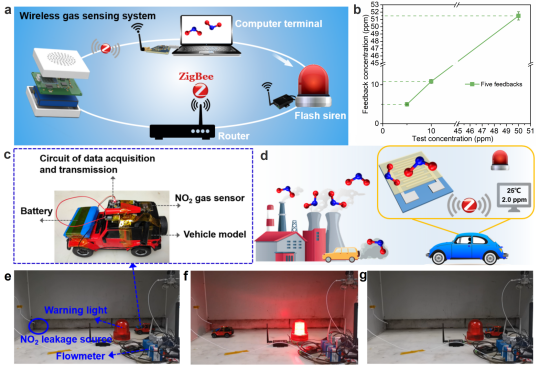 图7(a)无线传感系统原理图。(b)无线传感系统对5、10、50 ppm NO2的反馈结果。(c)遥控车装载测试电路、气体传感器与电池的光学照片。(d)无线传感系统在有害气体监测中的应用示意图。(e-g)用于气体泄漏报警的光学照片。