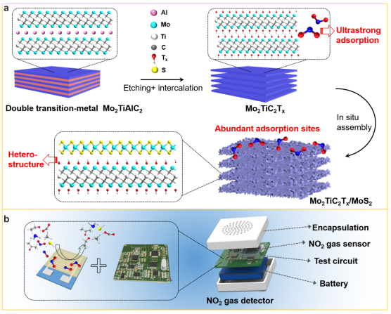 图1(a)Mo2TiC2Tx/MoS2复合材料合成示意图。(b)气体传感组件。