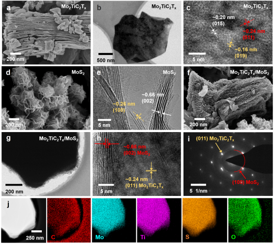 图2(a-c)Mo2TiC2Tx的SEM、TEM与HRTEM图像。(d-e)MoS2的SEM与HRTEM图像。(f-j)Mo2TiC2Tx/MoS2复合材料的SEM、TEM、HRTEMs图像,SAED衍射图与TEM元素映射图像。