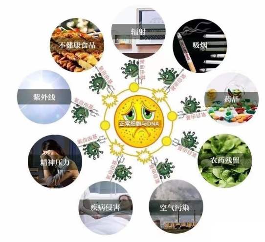 自由基反应在生物体内普遍存在,对生物的起源与进化理论提供了重要的依据。大量的研究表明,人体的许多疾病,例如:心脑血管疾病、癌症、艾滋病、老年痴呆和肝炎等的发病过程中都与活性氧自由基的参与密切相关。在生命的进化过程中,生物体随着年龄的增加,生命体开始逐渐老化,这个变化归因于环境和疾病,以及一个天生的过程,即衰老过程。在1954年,美国生物化学家Harman提出来自由基衰老学说,他认为人体内大量的自由基,尤其是氧自由基,会诱导机体发生氧化反应,对细胞成分进行长期有害的破坏,导致人体衰老和死亡(如图2),而且这种衰老过程本质上是不可逆。然而,他们提出了可以通过减缓自由基反应的起始速度和减少其链长来延长生物体的寿命,即通过增加生物体内自由基抑制剂(例如:超氧岐化酶、过氧化氢酶、谷胱甘肽过氧化物酶、维生素C和茶多酚等)的浓度或增加其成分对自由基攻击的抵抗力来实现[5]。