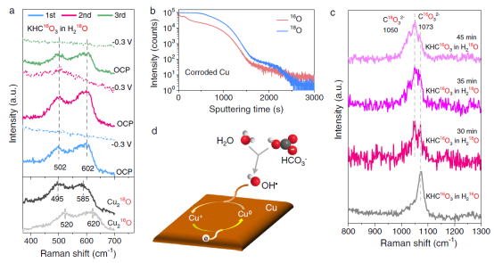 通过可再生电力驱动的电化学CO2还原反应(CO2RR)将CO2转化为附加值高的化学品已被公认为实现“碳中和”的一种有前景的策略。氧化铜衍生物(OD-Cu)已被证明是一组高效的CO2RR电催化剂,尤其是多碳产物(C2+)的催化剂。然而,确切的机理尚不清楚,人们提出了不同的观点。实验和理论计算均表明,Cuδ+/Cu0界面可以激活惰性CO2分子,促进CO-CO偶联。为了调节C2+产物的选择性,通过构建各种氧化预催化剂或采用CO2-脉冲电解,获得了多种具有Cuδ+位点特征的高效OD-Cu催化剂。了解OD-Cu在常用的CO2饱和KHCO3电解质中的还原/再氧化行为是一个巨大的挑战,但对确定氧化种类至关重要。近日,电子HTH官网地址 大学隆昶博士和崔春华教授以“Hydroxyl radicals dominate reoxidation of oxidederived Cu in electrochemical CO2 reduction”为题,在Nat. Commun上发表。作者通过电子顺磁共振技术,证实了HCO3–溶液中形成的强氧化性的羟基自由基(OH•)。此外,他们还结合了原位拉曼光谱、二次离子质谱和同位素标记,展示了OD-Cu表面的动态还原/再氧化行为,揭示了HCO3–和H2O之间的快速氧交换为OH•自由基的形成提供了氧源,连续生成会引起Cu电极的自发氧化,产生表面CuOx。值得注意的是,这项工作表明,阴极还原和OH•诱导的再氧化之间存在“跷跷板效应”,决定了CO2RR中Cuδ+物种的化学状态和含量。这一发现有望推动人们理解电解质在CO2RR中的关键作用。