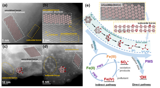 图5 5次循环试验后(a, b)原始硼和(c, d)残留硼的HAADF-STEM图像,(e)硼/铁(III)/PMS体系的机理[9]。
