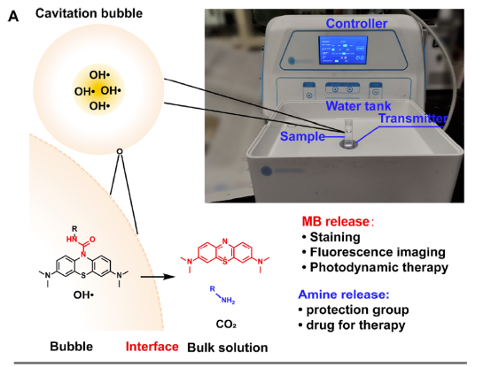 可控生物功能分子释放在生物学研究中具有重要作用。在预期的时间和位置释放感兴趣的分子不仅对研究基本生物机制不可或缺,而且还能减少疾病(如癌症)治疗中的不良影响和剂量依赖性毒性。一般来说,一个典型的可激活生物功能系统由四个元素组成:生物活性分子、可裂解连接剂、保护基团和刺激因子。当生物活性分子通过可裂解键与保护基团结合时,生物活性分子的功能将被关闭,而在感知到特定刺激后,连接子将被断开,活性分子释放,生物功能恢复。在各种可激活系统中,光响应的亲生物功能分子具有非侵入性和实时控制的高时空分辨率等突出优点,尤其吸引人。然而,光本身能够穿透组织的能力较低,大大限制了它的实际应用。作为一种替代方法,超声也具有像光一样的高时空控制,由于其成本低廉,已被用于临床成像和治疗。重要的是,与频率相对应,超声波可以穿透15厘米深的组织。超声波触发的细胞生物分子功能远程控制为我们研究自然提供了独特的优势。然而,设计治疗性超声响应功能分子的策略仍然难以捉摸,迄今为止已经开发出了罕见的超声可切割化学键。近日,大连理工大学彭孝军院士团队以“Urea-Bond Scission Induced by Therapeutic Ultrasound for Biofunctional Molecule Release”为题,在J. Am. Chem. Soc上发表。该团队首次证明了治疗性超声(1MHz)诱导脲键断裂用于药物释放。这种转变已被证实是由空化泡内部产生的羟基自由基(•OH)引发的,特别是在空化泡处−液体界面。该团队设计了一系列基于亚甲蓝(MB)的含脲键前药,即MBU。用低强度治疗超声进行超声处理后,与伯胺相连的脲键可以选择性地裂解,在生理相关的环境中释放游离MB,同时恢复吸光度、荧光和光敏性。此外,还开发了一种经FDA批准的含脲键的烷基化剂(MBU-Mel),成功地在深层癌细胞中实现了超声触发药物释放,显示了超声响应分子平台在生物活性分子释放方面的可扩展性。这可能为治疗性超声诱导药物释放奠定了起点,为“超声药理学”迈出了一步。