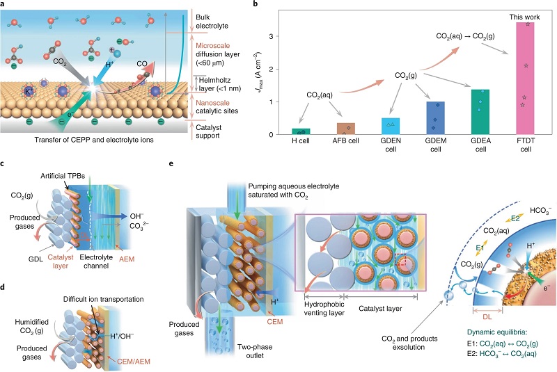 近年来,用于常温CO2还原反应(CO2RRs)的电催化材料在催化剂活性和选择性方面取得了重大进展。然而,CO2RR的工业应用需要加速反应速率(电流密度大于1 A cm-2)以最小化操作成本,组装大型经济电解池(电极尺寸超过100 cm2)以最小化资本成本。但是,当电流密度进一步增大时,反应受到传质的限制,提高了挑战性。因此,理想的电极结构需要平衡反应物进料、反应动力学和产物排出,同时减小流体动力扩散层局部微环境中各种物质的浓度梯度至关重要。在电解槽中使用气体扩散电极(GDEs),可以提高CO2在催化剂表面的局部浓度,所以在报道的GDE电解池中,一般的三相界面(TPBs)是通过CO2气相和液相碱性阴极液的同时进料来构建的,虽然该电解池可达到1.4 A cm-2的最大电流密度(Jmax),但输入的CO2反应物将损失成碳酸氢盐和碳酸盐,导致GDE空隙中的沉淀。此外,GDE电解池使用增湿CO2入口和膜电极组件,可以简化电池配置并提高稳定性。然而,这种电解池的Jmax仍很难超过1.0 A cm-2,可能与离子电导率降低和质子利用率低有关。因此,需要进一步提高生产速率和电极结构的稳定性,特别是对规模化电解池的组装。