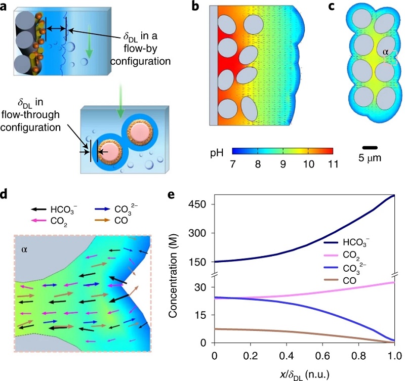 (e)模拟δDL和局部电流密度对不同CO2RR电池CO生成的依赖性;