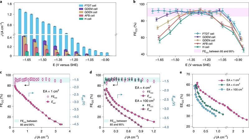 (c-d)对于三种不同EAs的FTDT电解池:EA=1、4和100 cm2,FECO和电池电压与电流密度的关系。