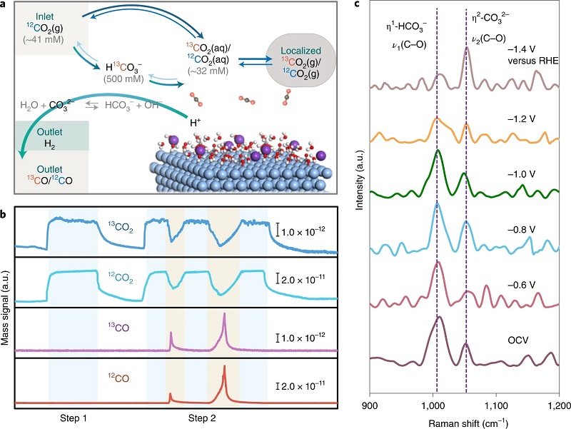 (b)来自产生的气体CO和残余CO2的DEMS信号,使用0.1 M H13CO3–溶液作为电解质进行两步测量;