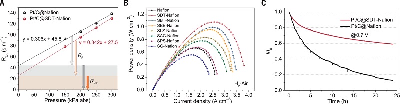 商用质子交换膜燃料电池(roton-exchange membrane fuel cells, PEMFCs)正极上的氧还原反应(ORR)通常由铂(Pt)基催化剂催化。然而,在保持高功率密度和耐用性时,减少PEMFCs的Pt负载量仍然具有挑战性。通过合金化和纳米结构策略制备新的催化剂,但其性能常通过旋转圆盘电极(RDE)技术进行评估,很难转化为膜电极。在膜电极组件(MEA)的催化剂层(CL)中,ORR发生在氧-水-催化剂三相界面。目前,全氟磺酸聚合物(PFSA或Nafion)是应用最广泛的离聚物,但PFSA包覆催化剂导致高气体扩散阻力。此外,Nafion中的-SO3H基团可强烈吸附并占据Pt表面的活性位点,从而降低Pt活性,进而降低相应的质量活性(MA)和功率密度。