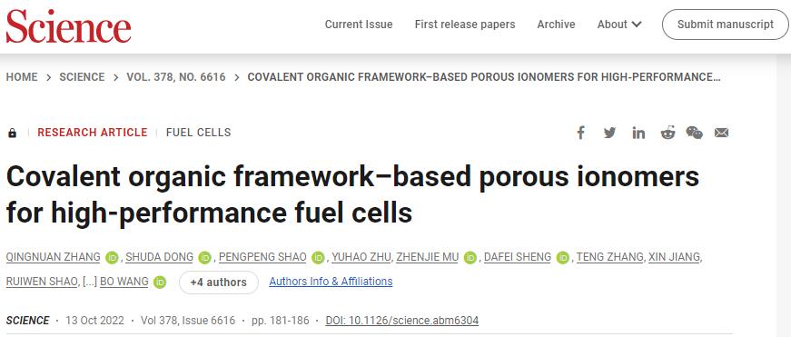 文献链接:Covalent organic framework-based porous ionomers for high-performance fuel cells. Science, 2022, DOI: 10.1126/science.abm6304.