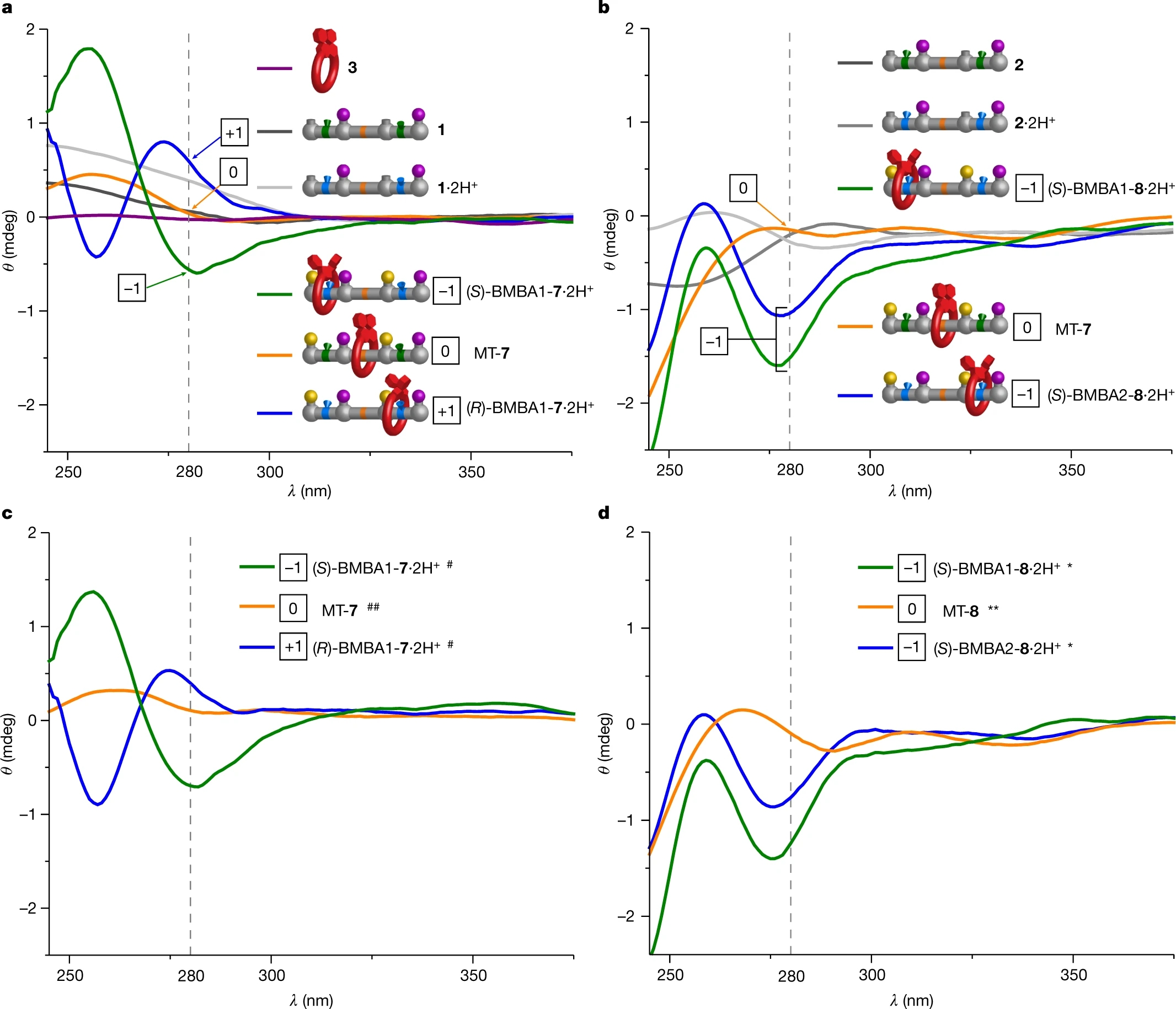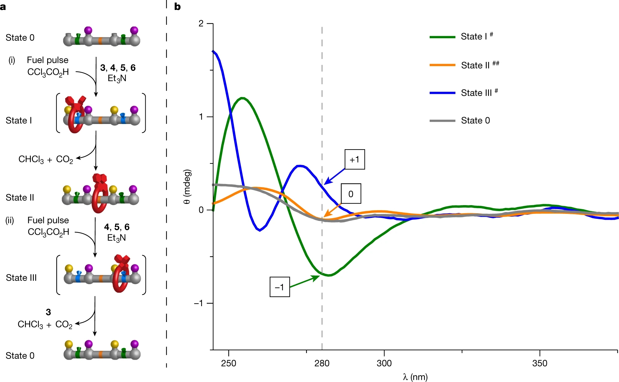 图2:通过3沿分子带1(编码−1,0,+1)和2(编码−1,0,−1)逐级棘轮操作形成的无螺纹组分和机器状态的CD光谱。