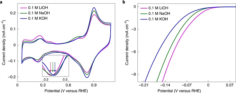 (a)在0.1 M MOH溶液(M=Li, Na和K)中,不同外加电位下Pt盘电极上的双层电容(Cdl);