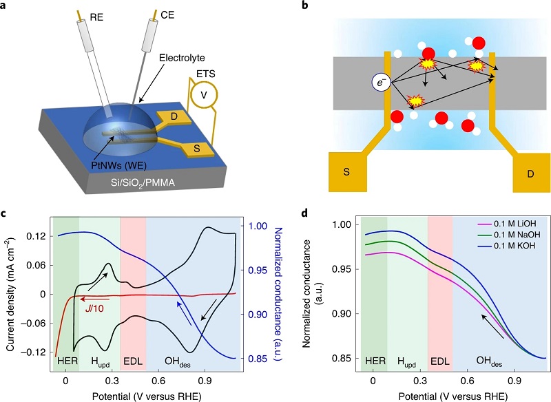 (a)ETS测量用片上PtNW器件,其中RE、CE和PtNWs(WE)分别是基准、计数器和工作电极,S和D分别代表源极和漏极端子;