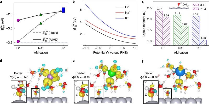 (a)静态计算和AIMD模拟中,存在Li+、Na+和K+时OH(EOHad)的吸附能;