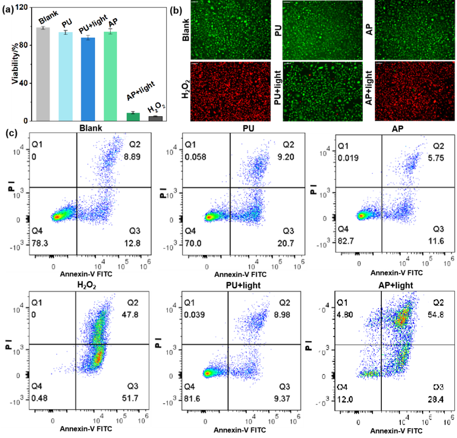 图 3.(a) 不同操作后乳腺癌细胞的细胞存活率(空白、PU、PU+光、AP、AP+光和H2O2)。(b) 不同操作后乳腺癌细胞染色的荧光图像。(c)不同操作后乳腺癌细胞的流式细胞术分析的点阵图(左下象限对应于活体,右上象限对应于早期凋亡,右下象限对应于晚期凋亡)。