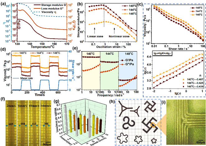 图 4.(a) AP熔体在稳态下的粘度-温度曲线以及振荡模式下G’和G”随温度变化曲线。(b) 140、144和148 °C时G’随振荡应变的变化曲线(c)稳态下以对数坐标绘制的剪切粘度-剪切速率曲线,以及对数剪切应力-剪切速率曲线。(d) 高剪切速率和低剪切速率交替下的粘度曲线。(e) G’ 和 G” 随频率的变化曲线。(f) 以2、6、10和14毫米/秒的打印速度挤出的打印线。(h) 具有各种形状的4D打印结构。(i)光学显微镜下的打印结构细节。