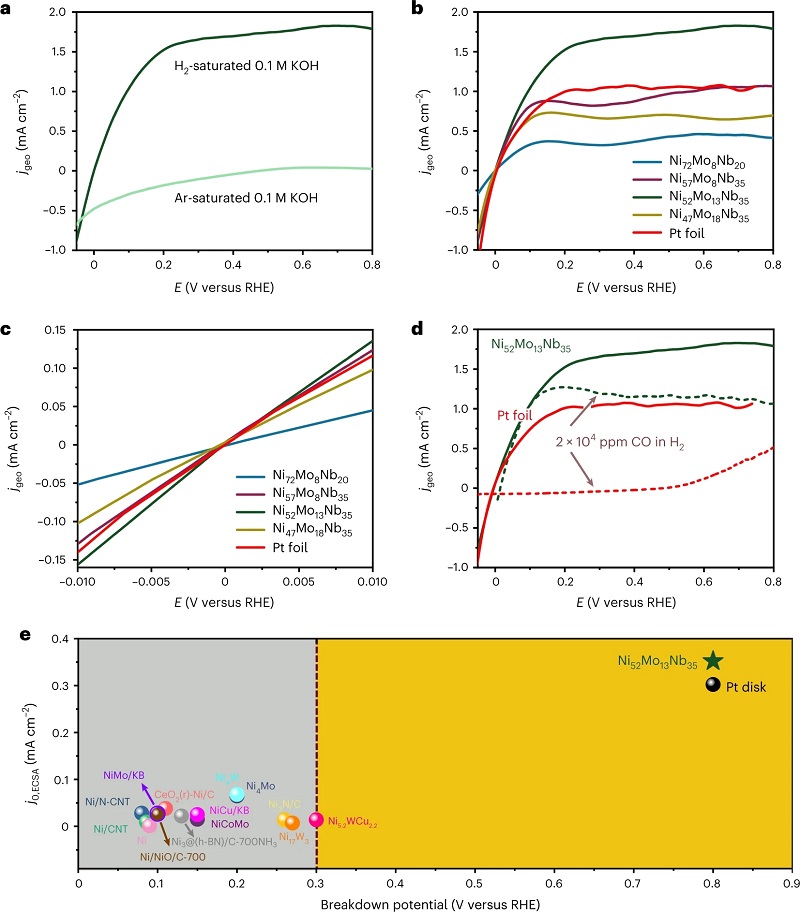 近日,中国科学技术大学高敏锐教授和南京理工大学兰司教授(共同通讯作者)等人报道了一种镍(Ni)-钼(Mo)-铌(Nb)三元金属玻璃(metallic glass, MG),在碱性电解质中其可以作为高活性和稳定的HOR电催化剂。实验测试发现,Ni52Mo13Nb35 MG的本征交换电流密度高达0.35 mA cm-2,优于商用Pt基催化剂(0.30 mA cm-2),并且在0.8 V vs. RHE条件下运行18 h后,其降解可以忽略不计。对于无PGM基HOR催化剂,其稳定窗口可达0.8 V。同时,该催化剂还表现出优异的CO耐受性(2 × 104 ppm CO in H2)。作者将Ni52Mo13Nb35 MG的显著HOR性能归因于Ni、Mo和Nb之间的协同相互作用,以及非晶态合金中有利的无序原子排列。此外,具有无PGM的Ni52Mo13Nb35负极的H2/O2和H2/空气HEMFCs分别获得了390和253 mW cm-2的功率密度,并具有良好的长期运行稳定性。研究成果以题为“Nickel-molybdenum-niobium metallic glass for efficient hydrogen oxidation in hydroxide exchange membrane fuel cells”发布在国际著名期刊Nature Catalysis上。
