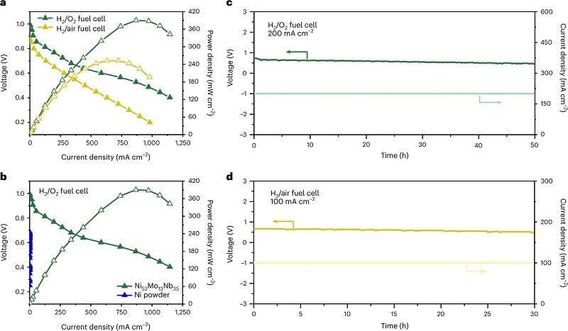 在碱性电解质中,Ni-Mo-Nb MGs可作为高活性和稳定的HOR电催化剂。具有无PGM Ni52Mo13Nb35负极的H2/O2和H2/空气HEMFCs的功率密度分别高达390和253 mW cm-2,并具有良好的长期运行稳定性。