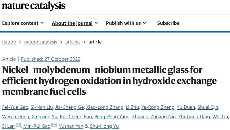 文献链接:Nickel-molybdenum-niobium metallic glass for efficient hydrogen oxidation in hydroxide exchange membrane fuel cells. Nature Catalysis, 2022, DOI: 10.1038/s41929-022-00862-8.