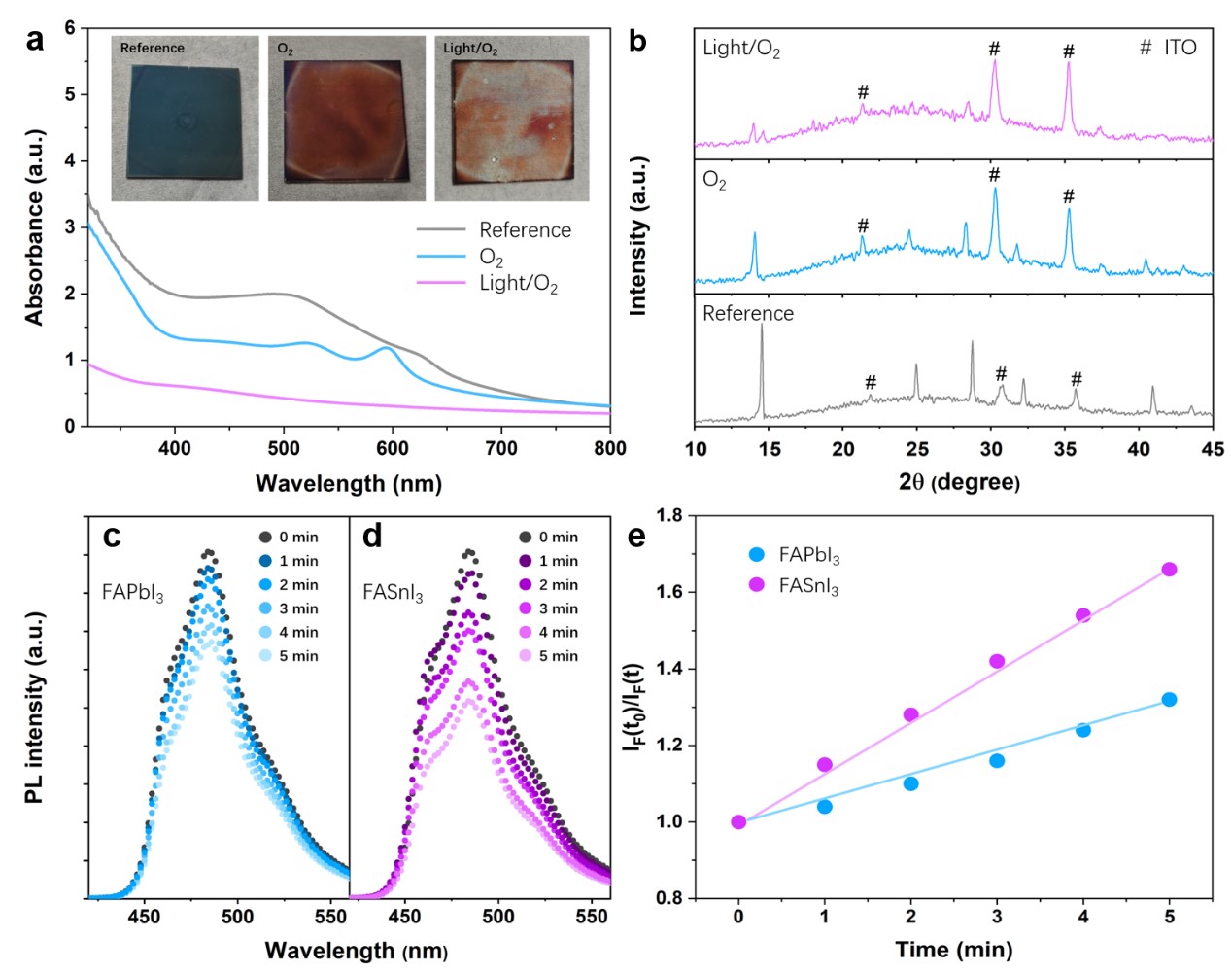 图1. 氧气暴露条件下、光氧暴露条件下、以及参比FASnI3薄膜的照片、UV-vis光谱,XRD图谱,证明了光氧暴露条件下,薄膜发生的降解更为严重;超氧荧光探针测试表明,相比于FAPbI3,FASnI3在光氧条件下的超氧产率更高。