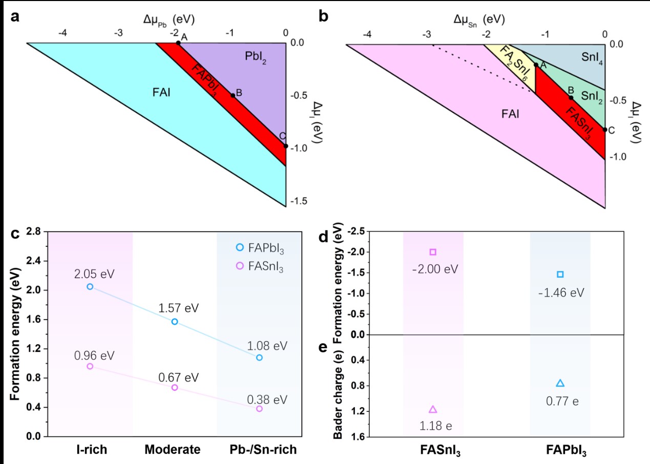 图3. 第一性原理计算相关:FAPbI3与FASnI3以相对化学势函数的热平衡生长条件的相图,符合两种钙钛矿热力学平衡生长条件的区域用红色标记。基于此,得到了不同生长条件下FAPbI3和FASnI3中VI的形成能,当氧气掺入含VI的钙钛矿中时超氧离子的形成能,以及相应的Bader电荷以显示电子转移到氧气的量。计算结果表明,超氧离子的最优形成位点VI在FASnI3中更容易形成,并且在FASnI3的VI处的超氧离子的生成在能量上更加有利。