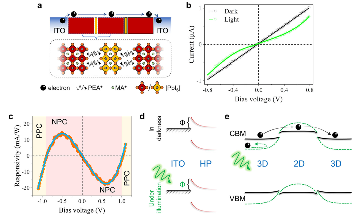 通过光/暗条件测试发现GIHP薄膜的光致接触特性转变及负光电导效应,推断光诱导势垒源于2D/3D界面,进一步研究2D/3D界面的载流子动力学揭示了PCB效应的产生机制。