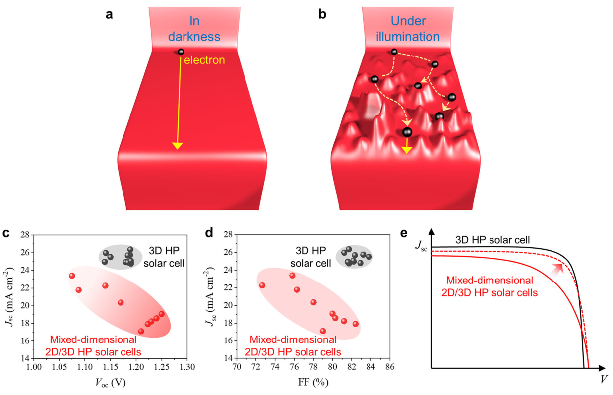(e) 3D钙钛矿太阳能电池和2D/3D钙钛矿太阳能电池的J-V特性。红色实线代表最先进的混合维2D/3D HP太阳能电池的J-V特性,红色虚线代表其没有PCB效应的预期J-V特性。