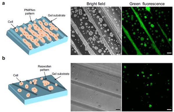 (a)在具有PNIPAm条带图案的DN水凝胶表面上培养细胞;