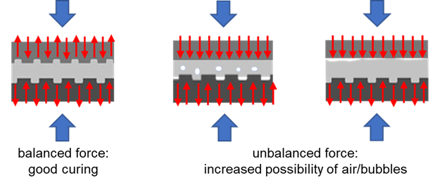 5.基于4的进一步分析、参考其他相关文献、补充更多实验证据后给出了异种材料粘接新机理解释(图6):当粘接接头两端材料平整、对称时,胶膜在固化时受力较为均匀;当粘接接头两端材料不对称时,胶膜来自两端受压不对称,内部受力不均匀,固化时容易有气泡产生,最终导致缺陷,拉低粘接强度。