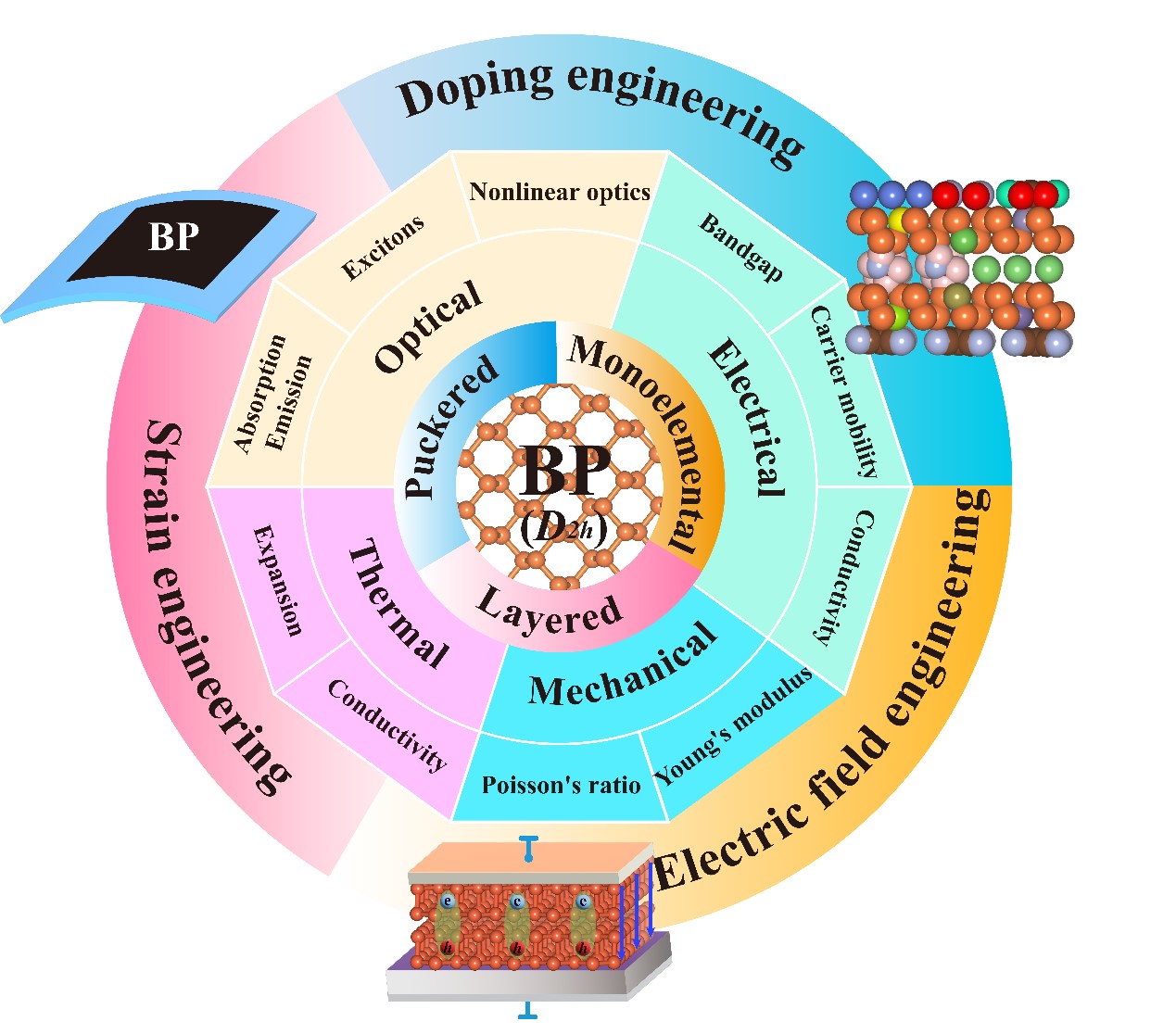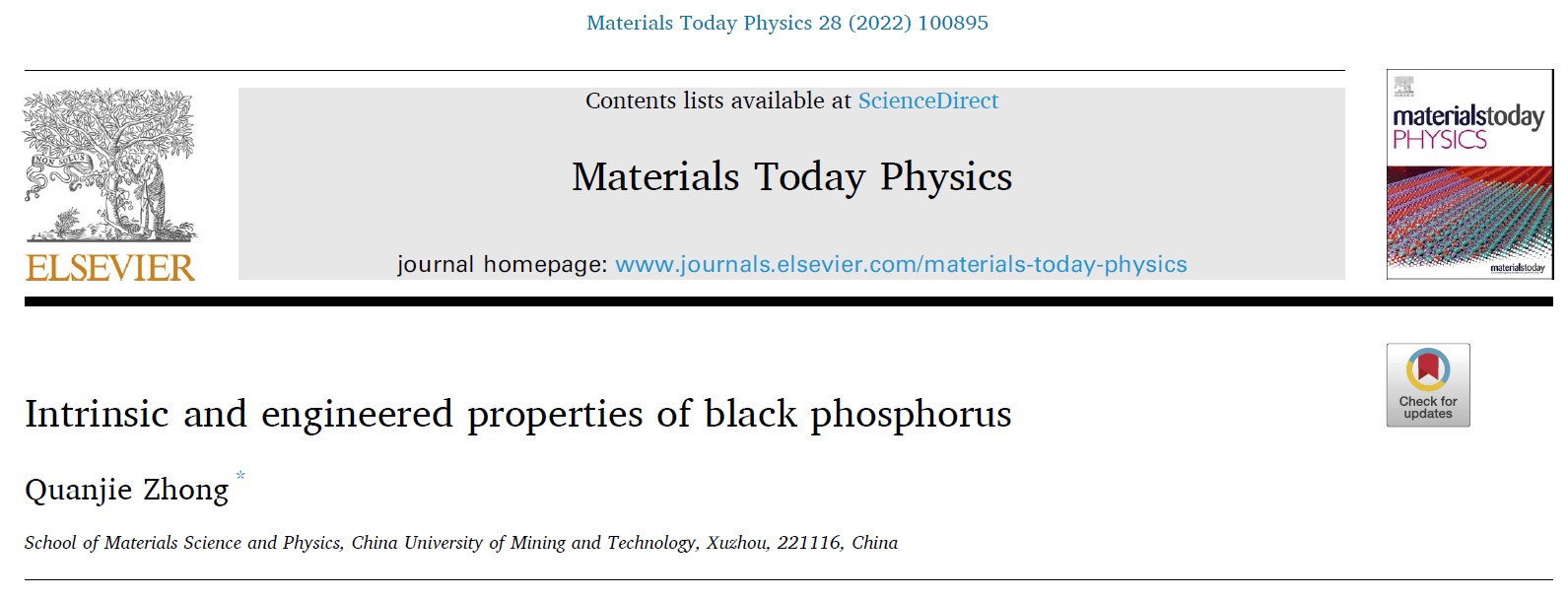 近日,中国矿业大学材料与物理学院的青年教师钟全洁以唯一作者身份在国际重要期刊Materials Today Physics 发表了题为“Intrinsic and engineered properties of black phosphorus”的综述文章 (DOI: 10.1016/j.mtphys.2022.100895),深入讨论了黑磷固有的性质以及调控这些性质的策略。