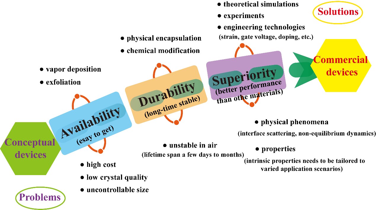 图9. 黑磷从概念性的器件到商业化的设备需要在可获得性(availability)、耐用性(durability)、优越性(superiority)三个方面进一步研究。
