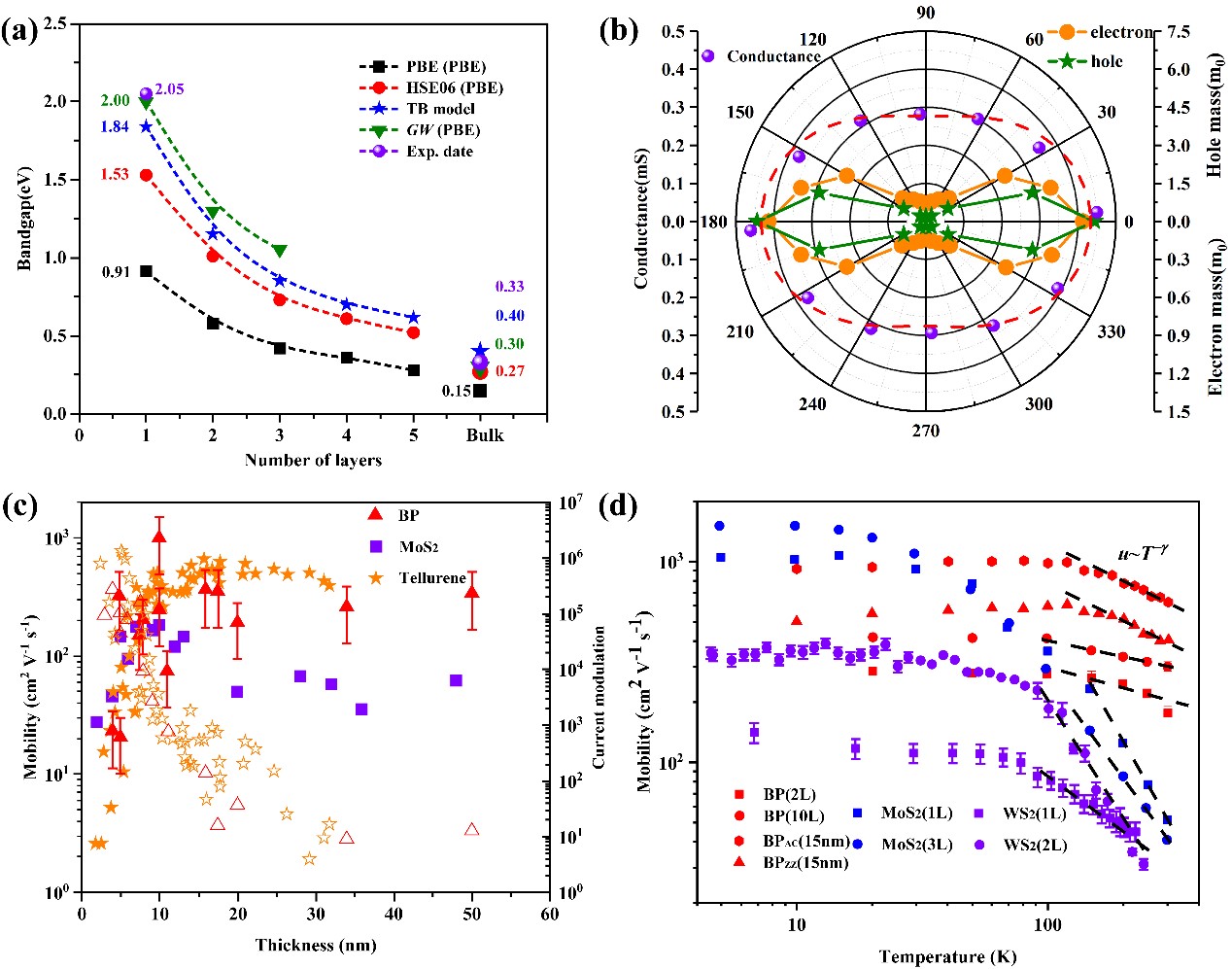图2. (a)黑磷带隙随厚度的变化规律。(b)黑磷电导、电子有效质量和空穴有效质量随晶体方向的演化规律。(c)黑磷、二硫化钼、碲载流子迁移率和开/关比率随厚度的变化规律。(d) 黑磷、二硫化钼、二硫化钨载流子迁移率随温度的演化规律。