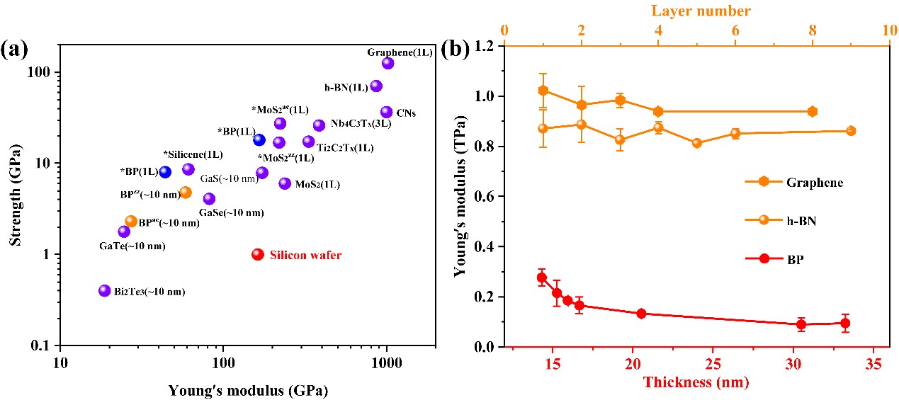 图4. (a)黑磷等材料的杨氏模量-强度图。(b)黑磷、二硫化钼、氮化硼杨氏模量随厚度的变化规律。