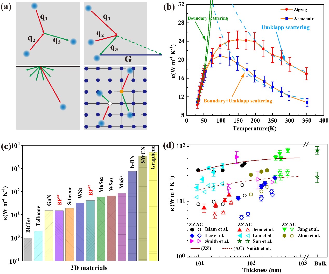 图5. (a)声子散射示意图。(b)黑磷热导率随温度的演化规律。(c)黑磷等材料热导率的比较。(d)黑磷热导率随厚度的变化规律。